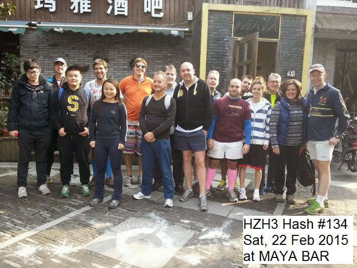 Near the beginning of 2014, the Hangzhou Hash House Harriers (HZH3 / HHHH) was restarted by H.E.I.D.E., Roomboy and Sweet FA after a break of 3 long years of no Hashing in Hangzhou!!! The first new Hangzhou Hash event, HZH3 Hash #134, was held on Sat, 22 Feb 2014. It started at that favourite haunt of Hangzhou Hashers, Maya Bar, of course! 🙂